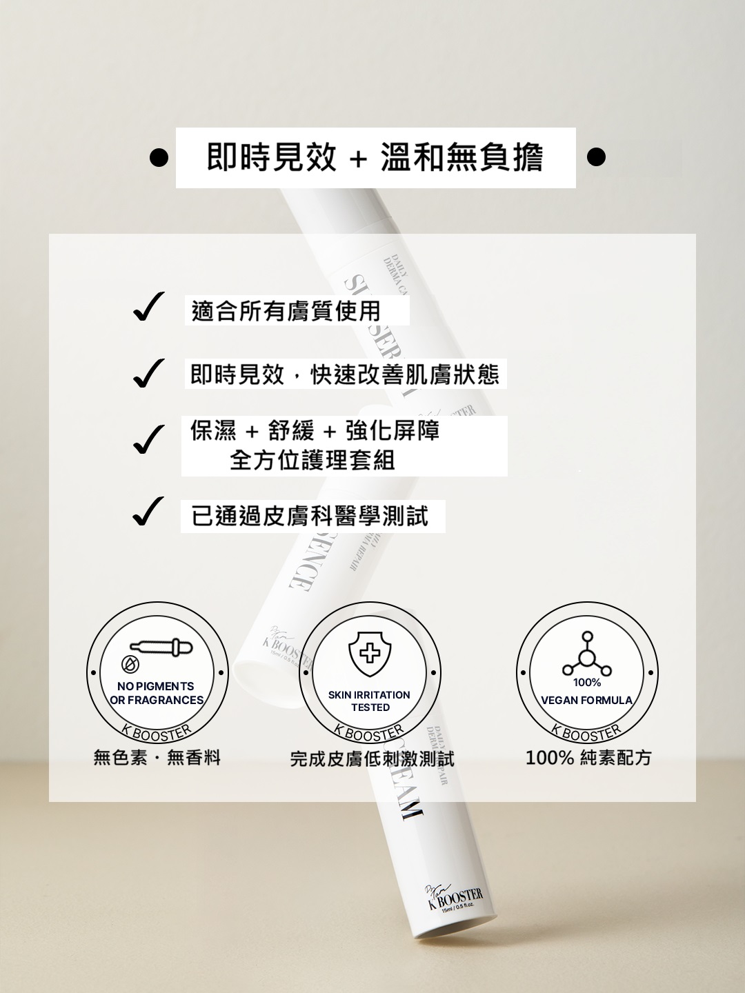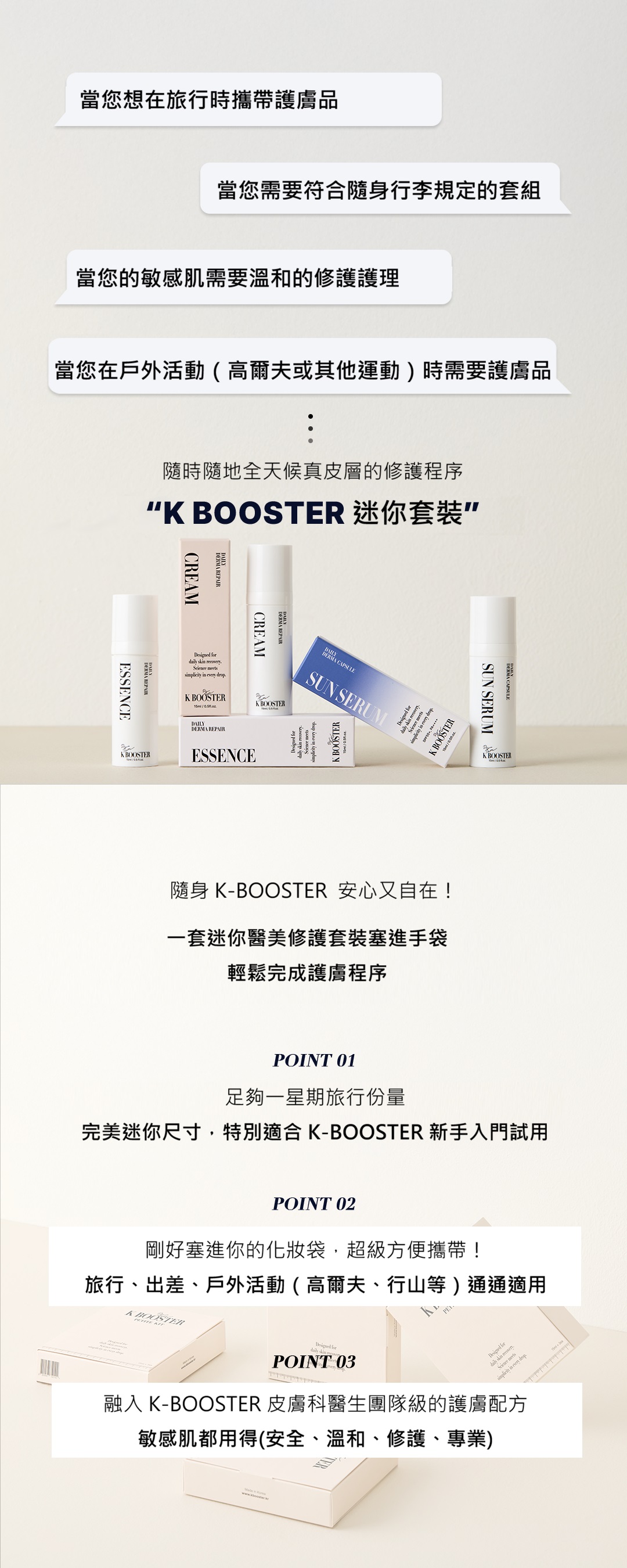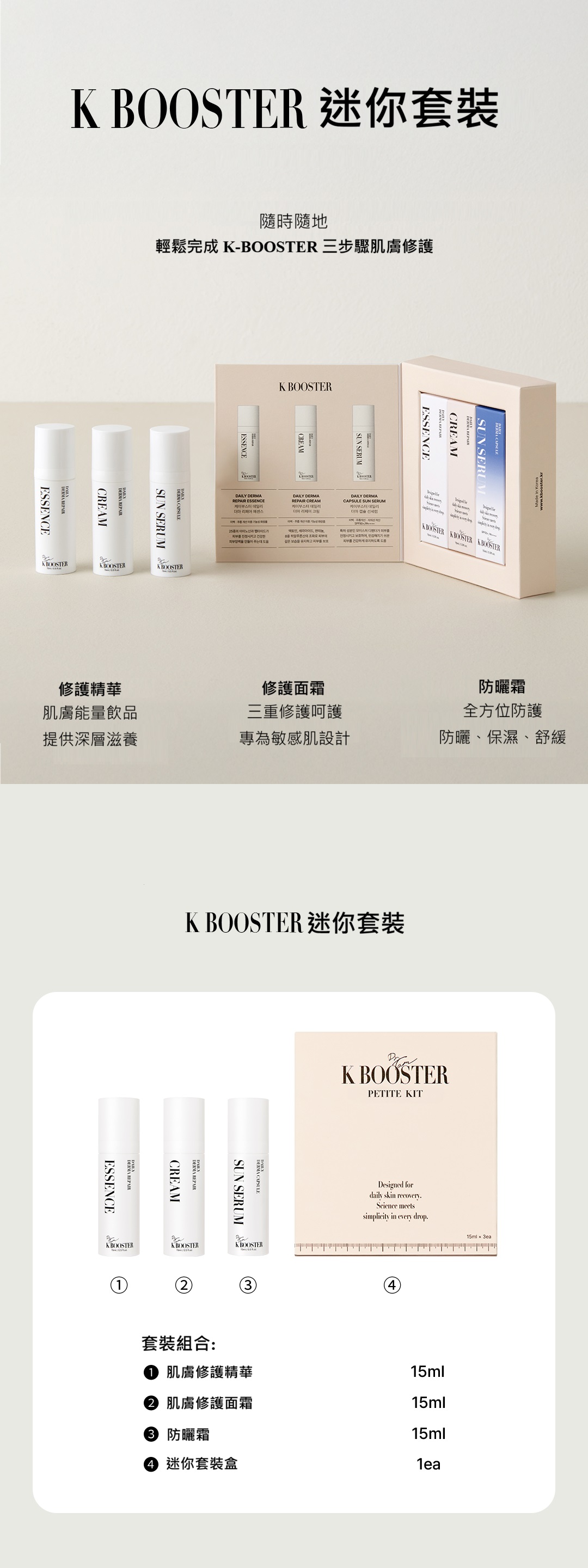 隨時隨地啟動K Booster 3步驟護膚程序,隨身攜帶去旅行、出差、戶外活動。 肌膚修護面霜 15ml 肌膚修護精華 15ml 防曬 15ml